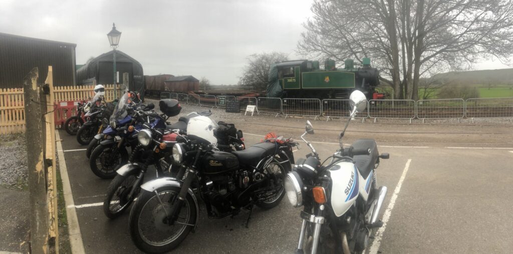 We set off and were soon on the Old Sherborne Road at a brisk pace with Steve Eddington at the helm. The tail end of the ride became stretched for a number of different reasons, but, like all good elastic the tail caught up with the head of the ride and we arrived together at Shillingstone Station – a heritage steam railway site for the North Dorset Railway (https://www.northdorsetrailway.co.uk/).